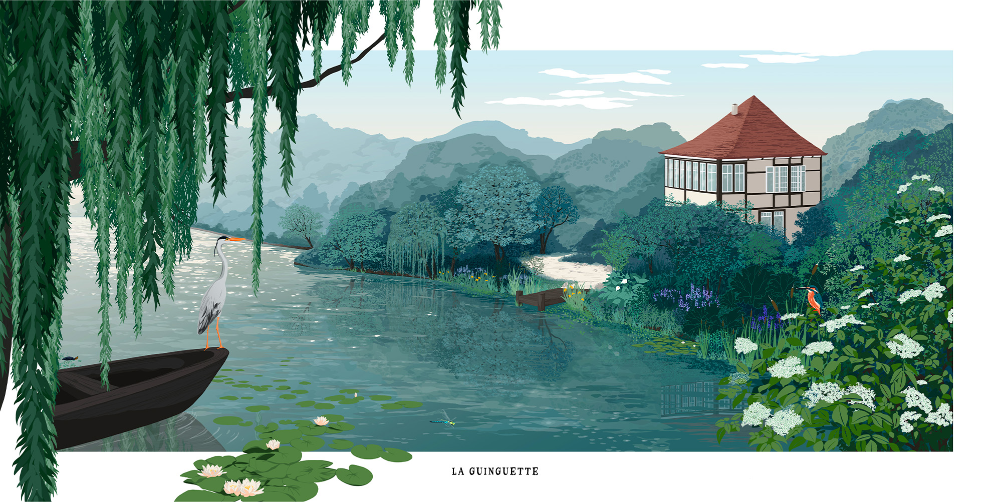 Réalisée pour une cliente ayant acquis une maison en bord de Marne, cette illustration rend hommage à l’histoire singulière du lieu, autrefois une véritable guinguette. Située en région parisienne, la maison conserve le charme typique des bords de rivière et une mémoire joyeuse liée à la fête, à la musique et à la convivialité. À partir d’anciennes photographies, j’ai recréé une vision graphique de la maison, mêlant patrimoine local, atmosphère impressionniste et interprétation artistique. Cette illustration sur mesure célèbre à la fois le passé du lieu et son nouveau chapitre, dans un esprit de transmission et de poésie visuelle.