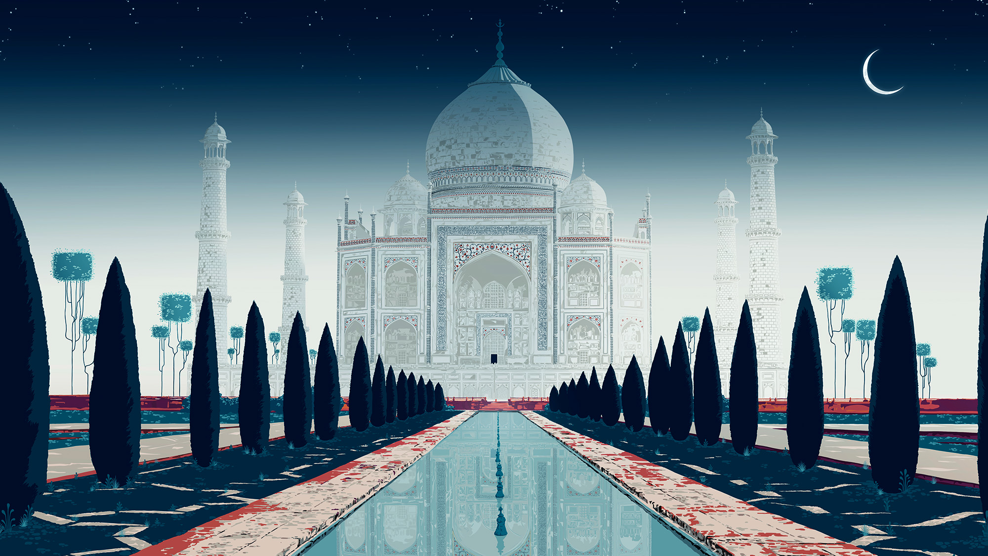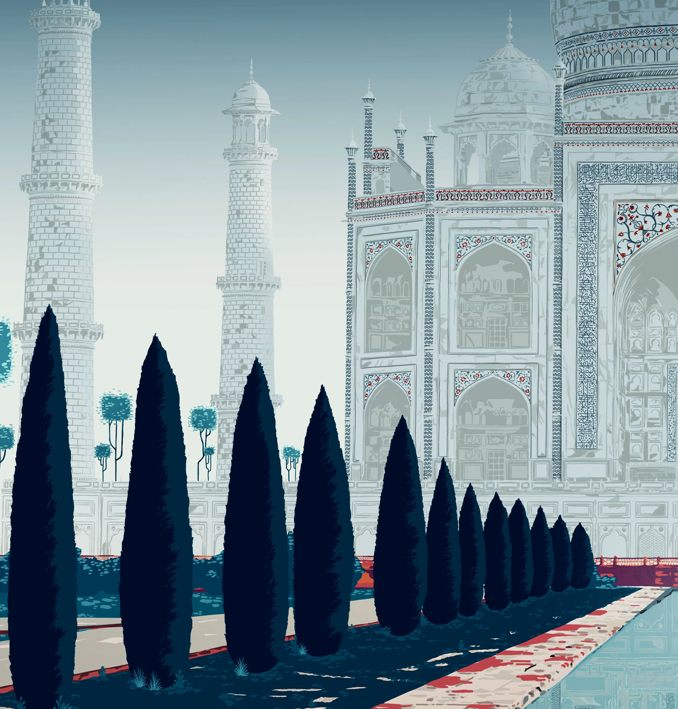 Cette illustration présente une interprétation artistique du Taj Mahal réalisée en digital painting. Cette technique numérique permet de capturer les détails architecturaux emblématiques du monument tout en offrant une approche personnelle de cette merveille du monde. L'œuvre explore les jeux de lumière sur le marbre blanc caractéristique du mausolée, ainsi que les proportions harmonieuses de sa structure. Le digital painting offre la possibilité de travailler les nuances colorées et les effets atmosphériques pour créer une vision contemporaine de ce chef-d'œuvre de l'architecture moghole. Cette création illustre les possibilités du digital painting dans la représentation de monuments historiques, alliant précision technique et expression artistique personnelle.