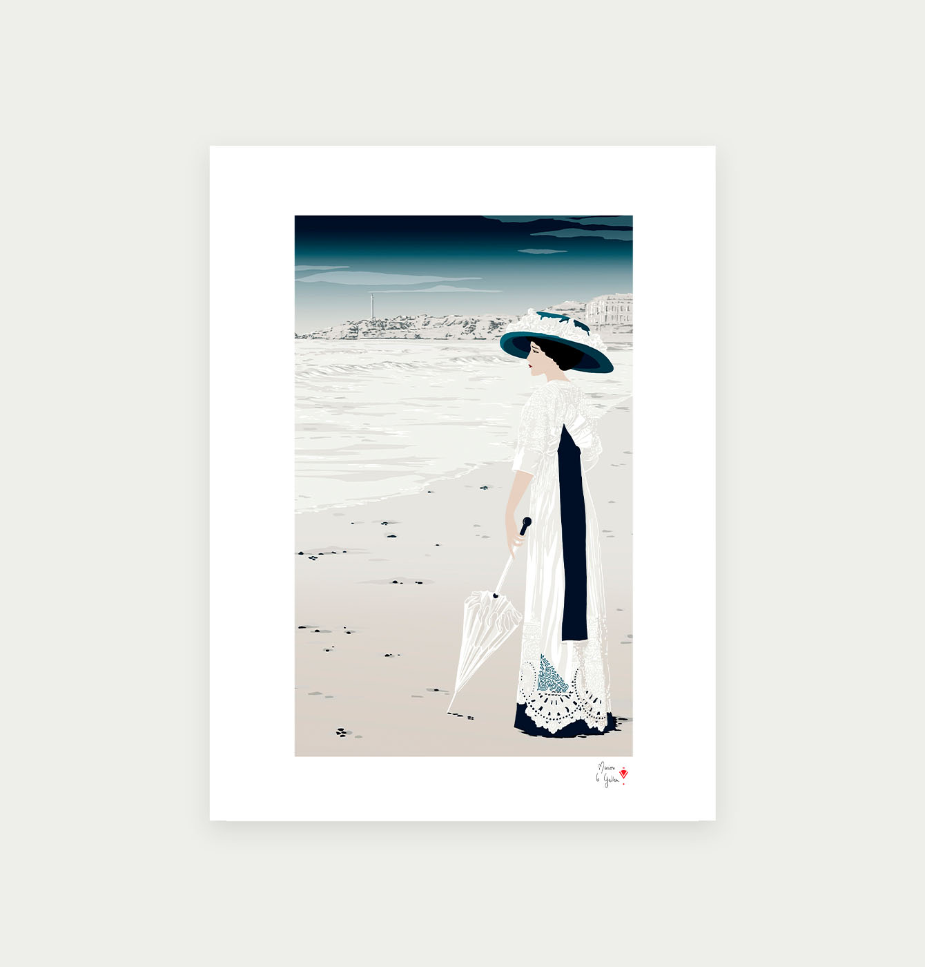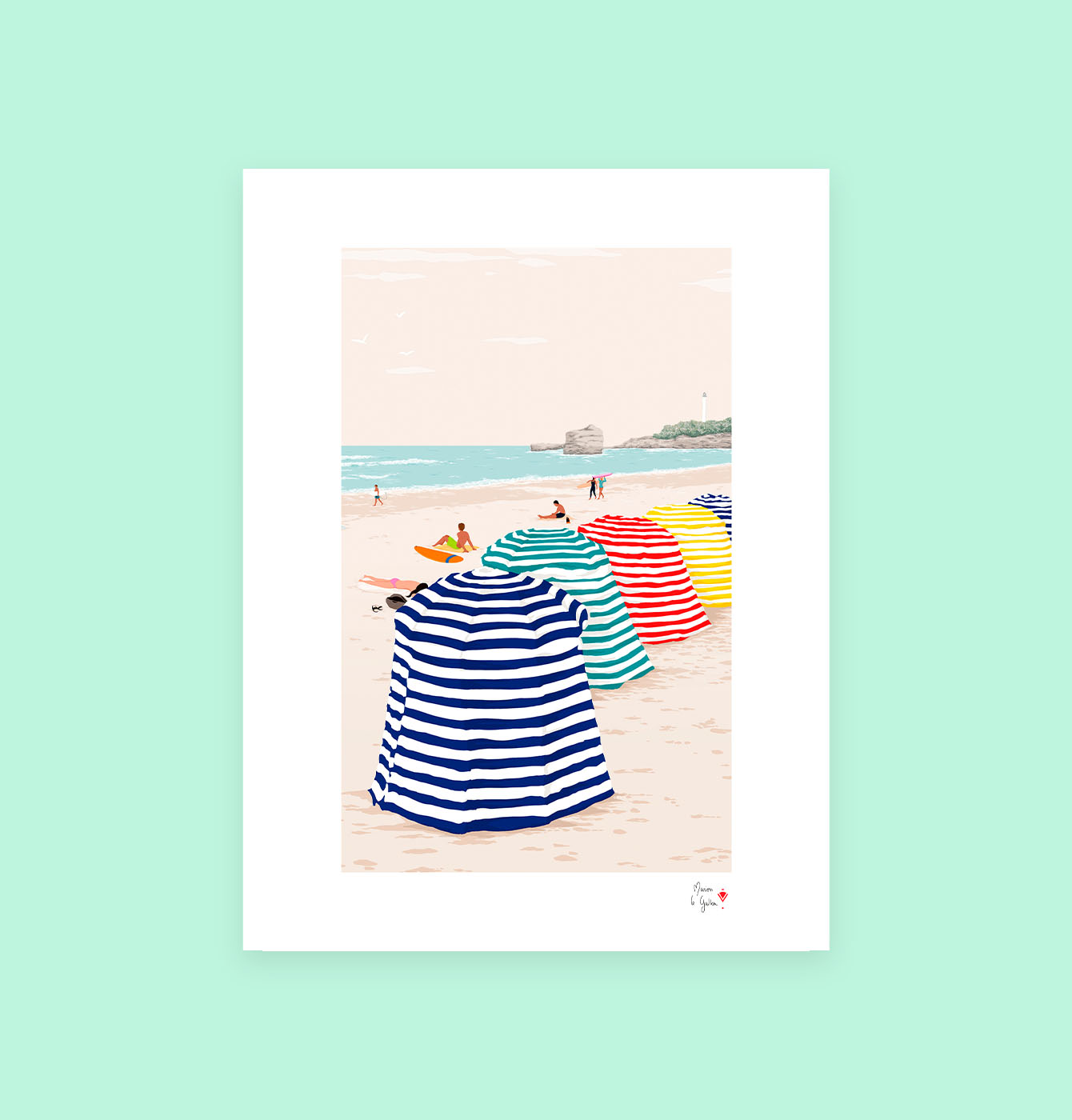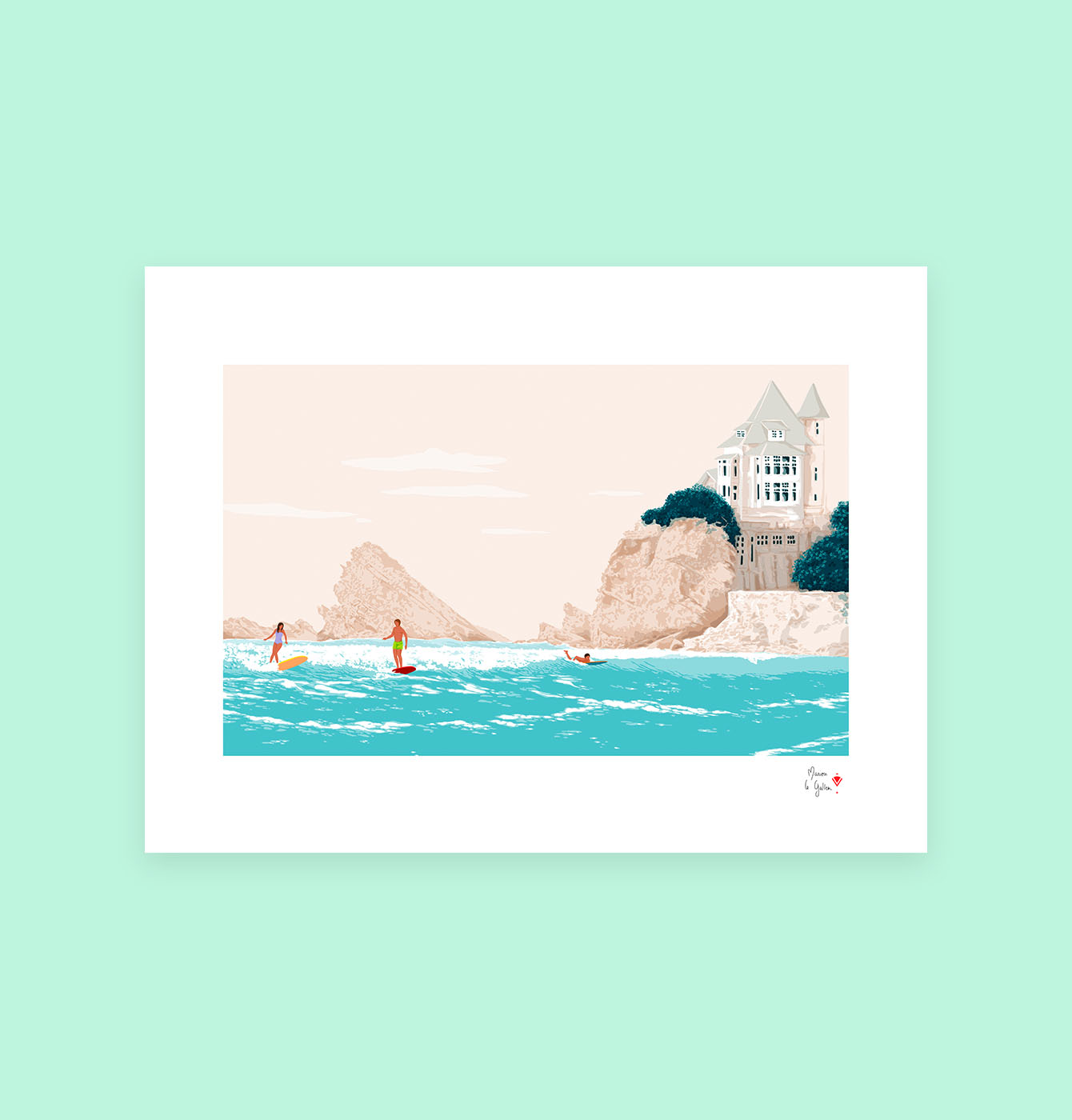 En 2021, j’ai collaboré avec les Galeries Lafayette de Biarritz pour concevoir une série d’illustrations sur mesure à la fois décoratives et éditoriales. Ce projet visait à valoriser l’image du magasin à travers une communication artistique forte, tout en proposant les œuvres à la vente au sein de l’espace boutique. Inspirée de l’esthétique de la côte basque, la série mêle formes douces, teintes naturelles et scènes de vie stylisées. Chaque illustration est pensée comme une évocation poétique de Biarritz : architecture, surf, élégance, lumière et nature. Les visuels ont été conçus en illustration digitale, avec une qualité professionnelle permettant une impression en grand format (vitrines) et en édition limitée pour la vente.