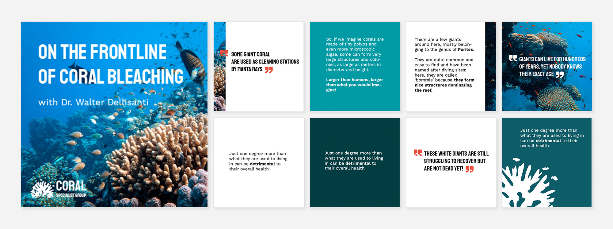 Création de l’identité visuelle du Coral Specialist Group de l’IUCN (Union Internationale pour la Conservation de la Nature), un réseau international d’experts scientifiques dédié à la recherche et à la protection des récifs coralliens. Le projet comprend la conception du logo, la définition d’une charte graphique complète ainsi que le développement d’un univers visuel à la fois scientifique, accessible et ancré dans les enjeux environnementaux contemporains.