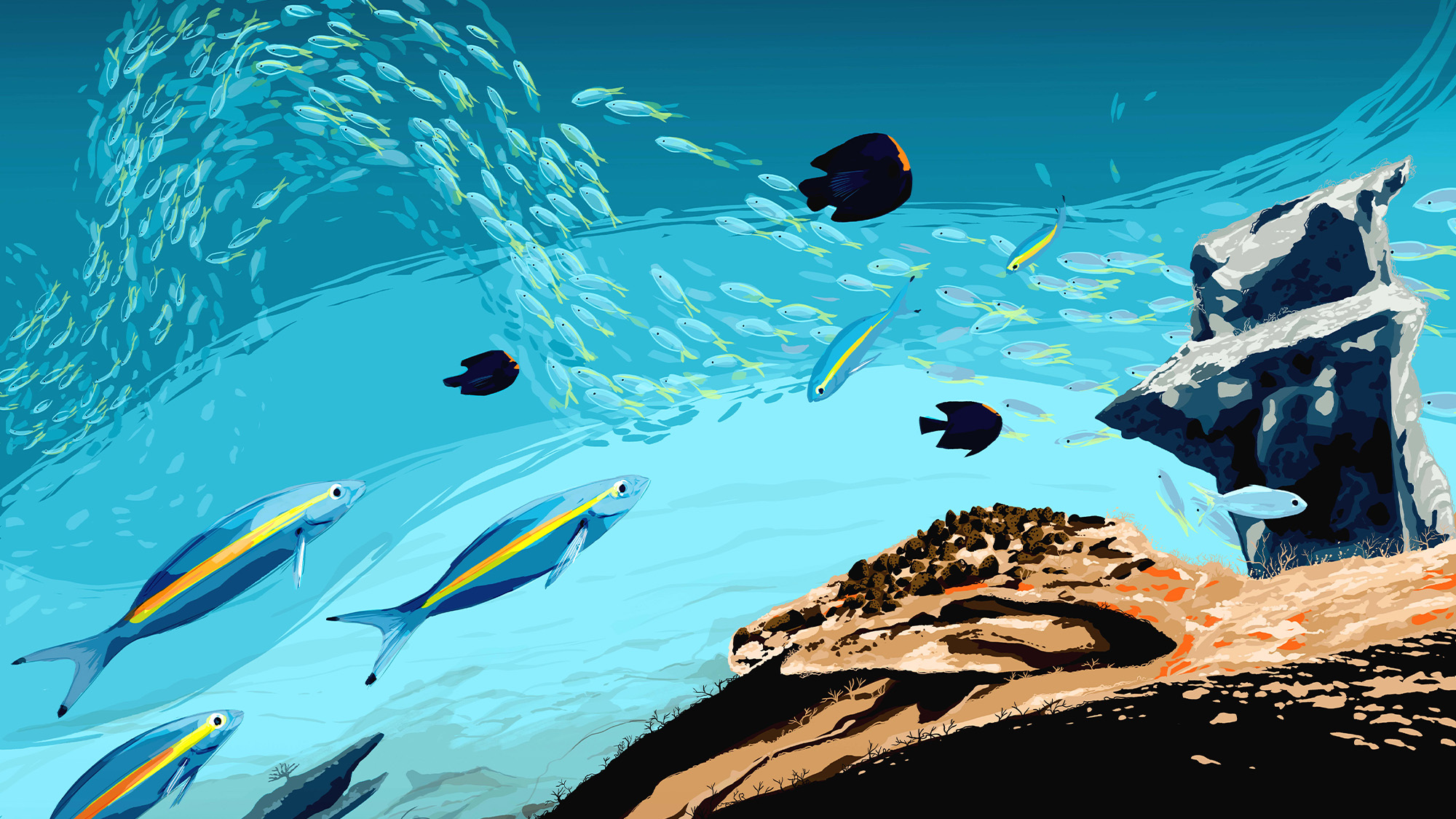 Un voyage visuel mêlant souvenirs et recherche graphique, pour retranscrire la poésie des reliefs maritimes. Il s’agit d’un carnet visuel entre mouvement et contemplation. Chaque image est pensée comme un fragment de paysage, nourri de mes expériences de voyage et de mon attachement pour l’océan Indien.