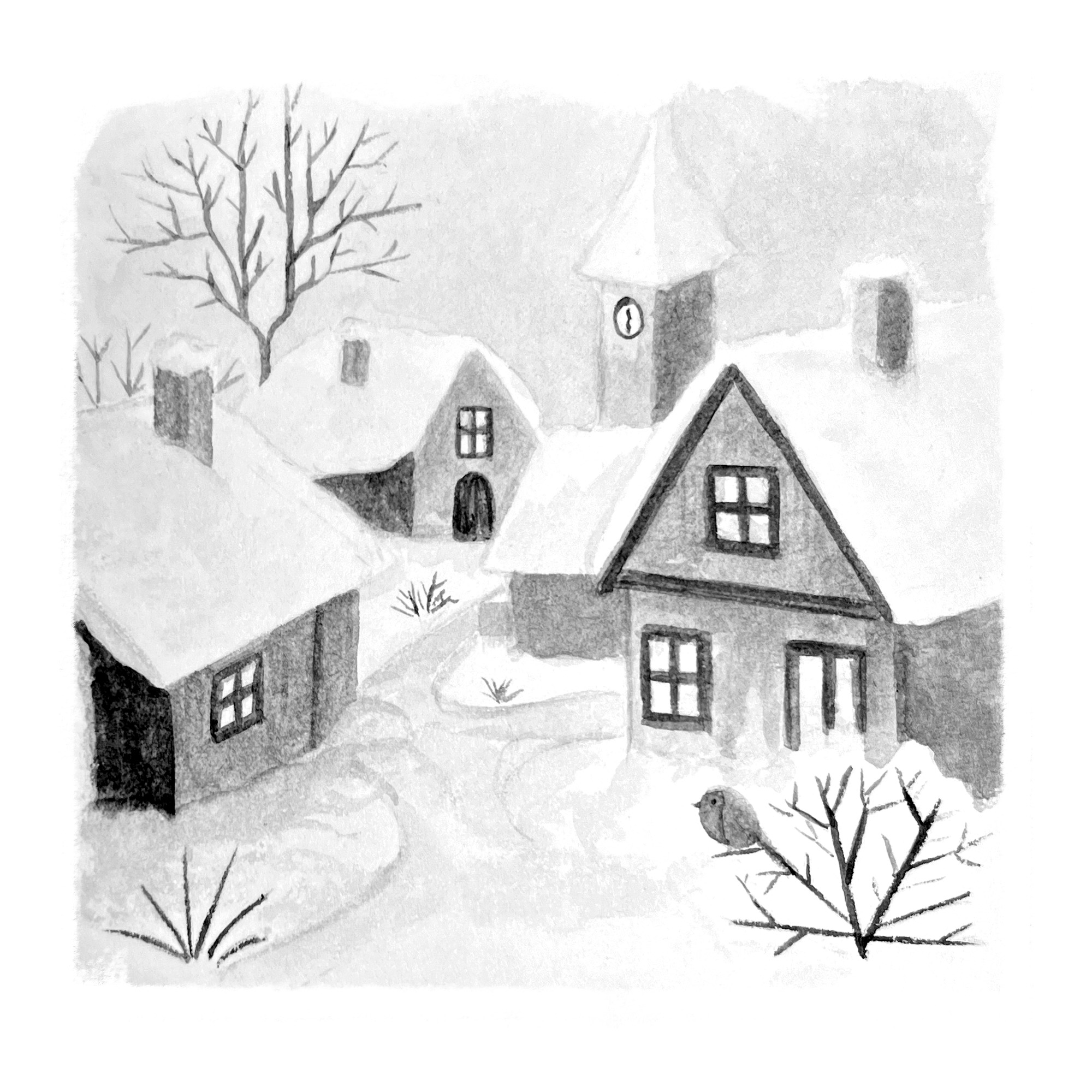 Pendant qu'Aurore dormait, de petits flocons étaient tombés du ciel toute la nuit. Maintenant, tout le village était recouvert d'un grand manteau blanc et brillant. Les toits, les arbres, la place du village... tout était magique !