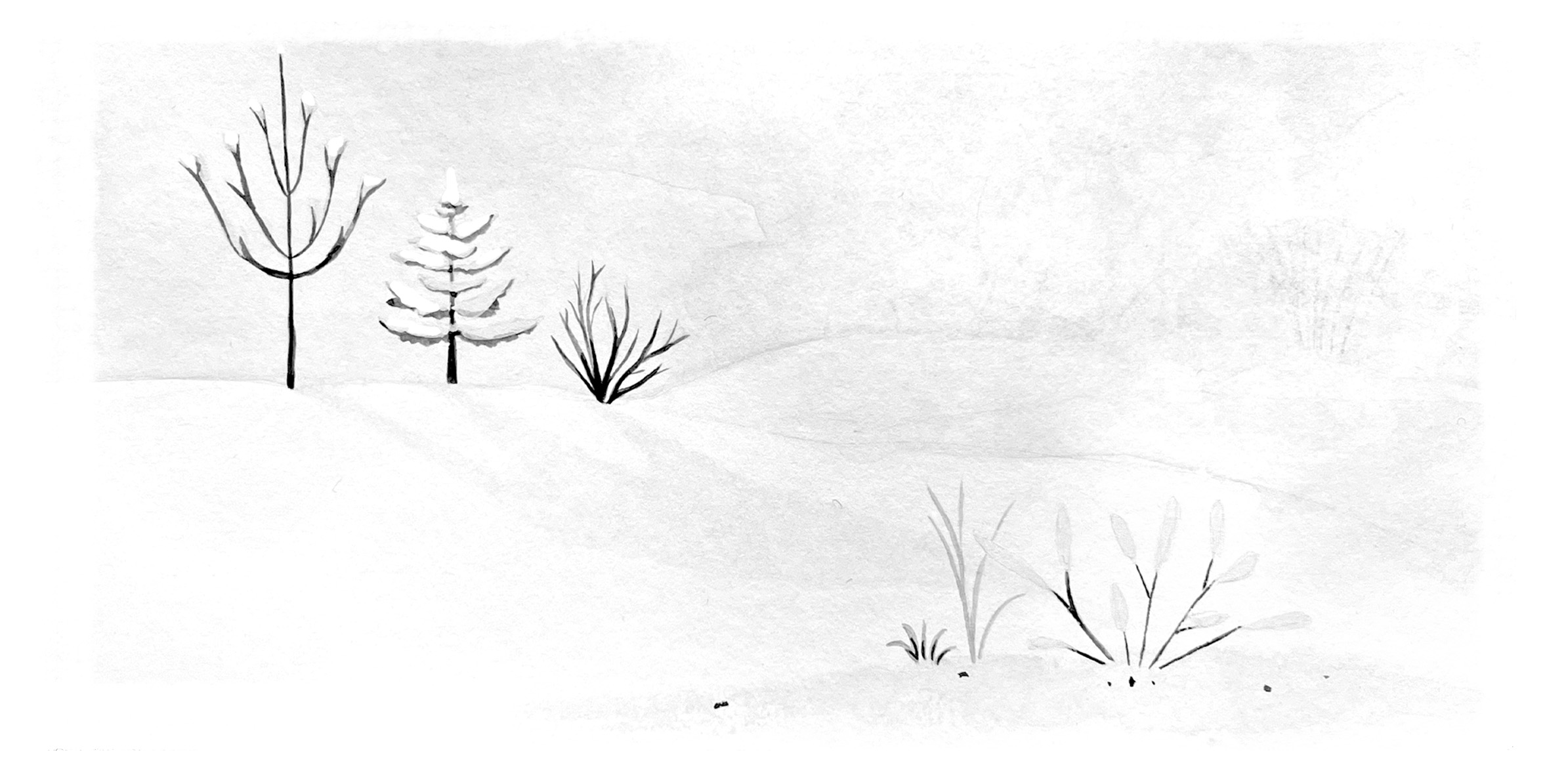 Aurore décida d'aller voir la forêt toute blanche. Sous les grands sapins couverts de neige, tout était silencieux. On aurait dit un palais de glace. Soudain, elle vit quelque chose bouger !
