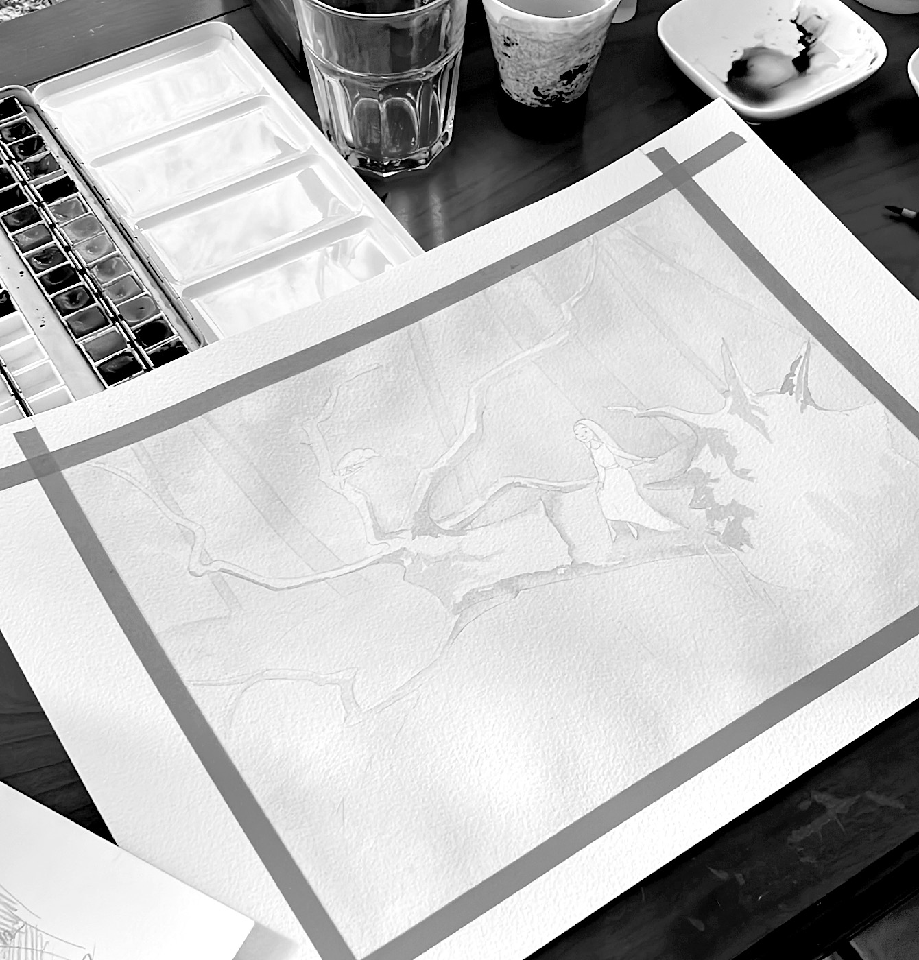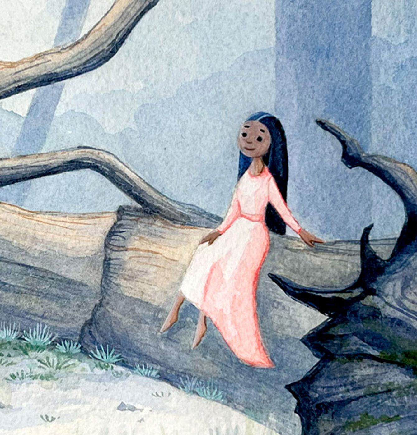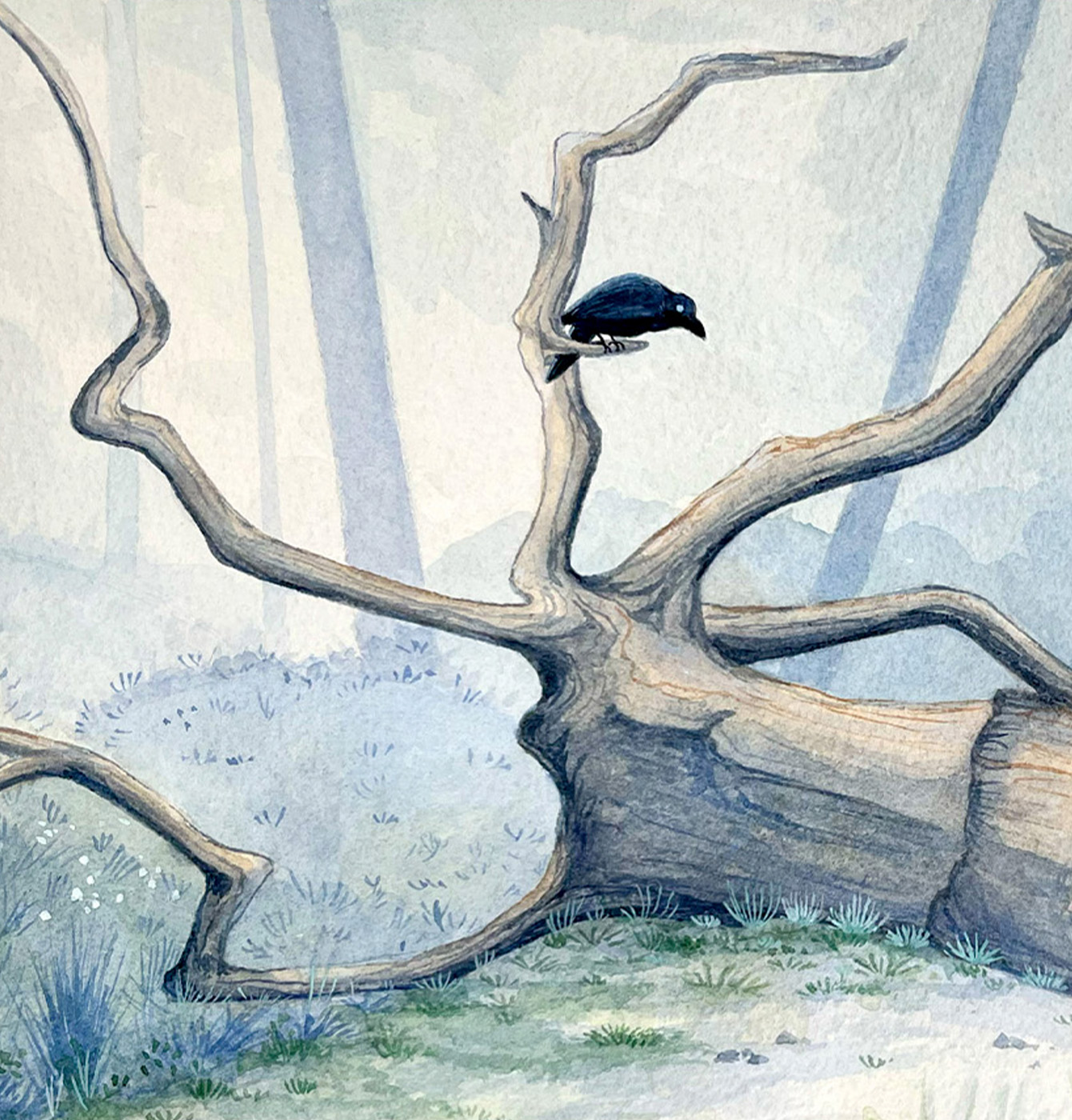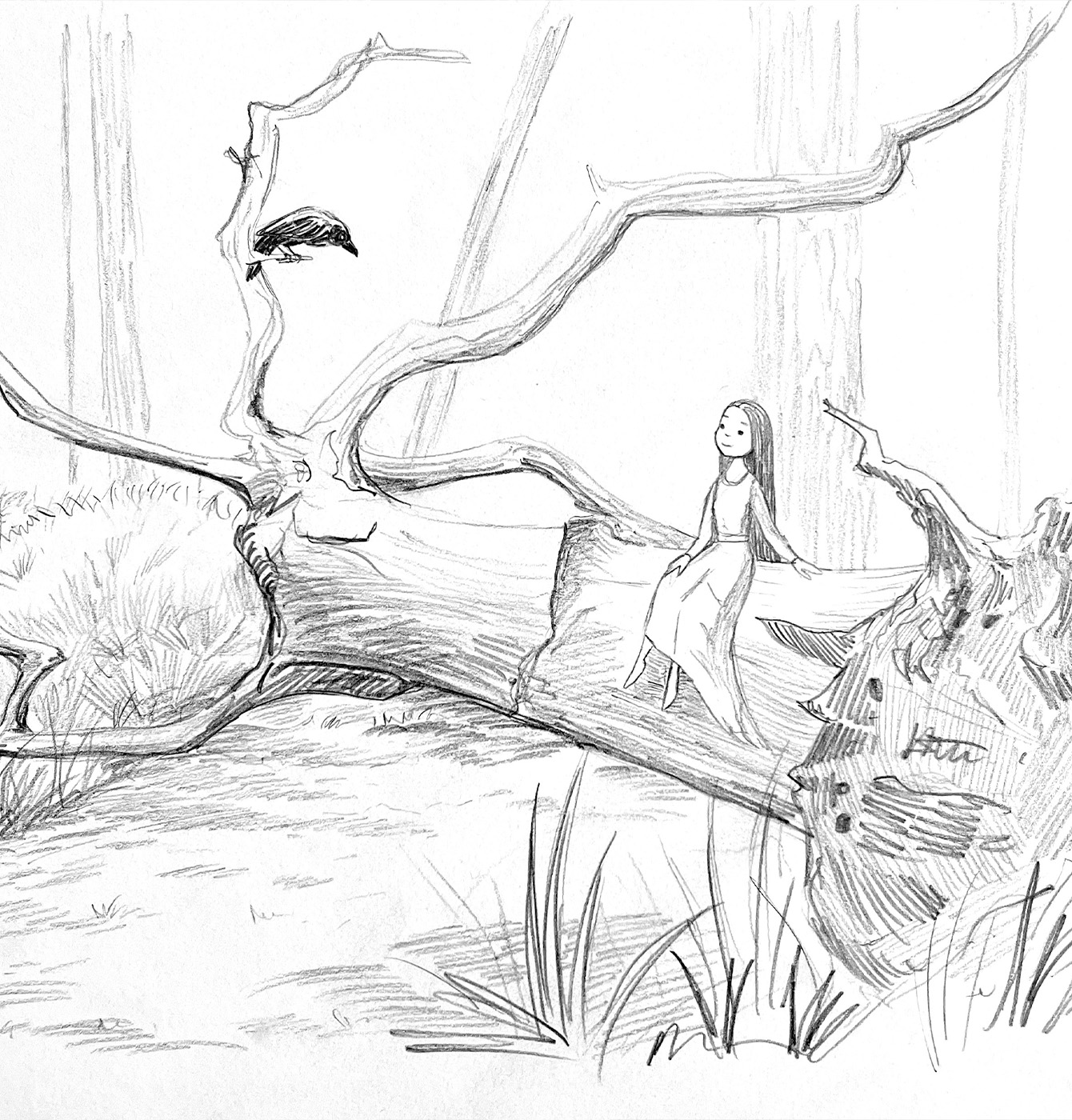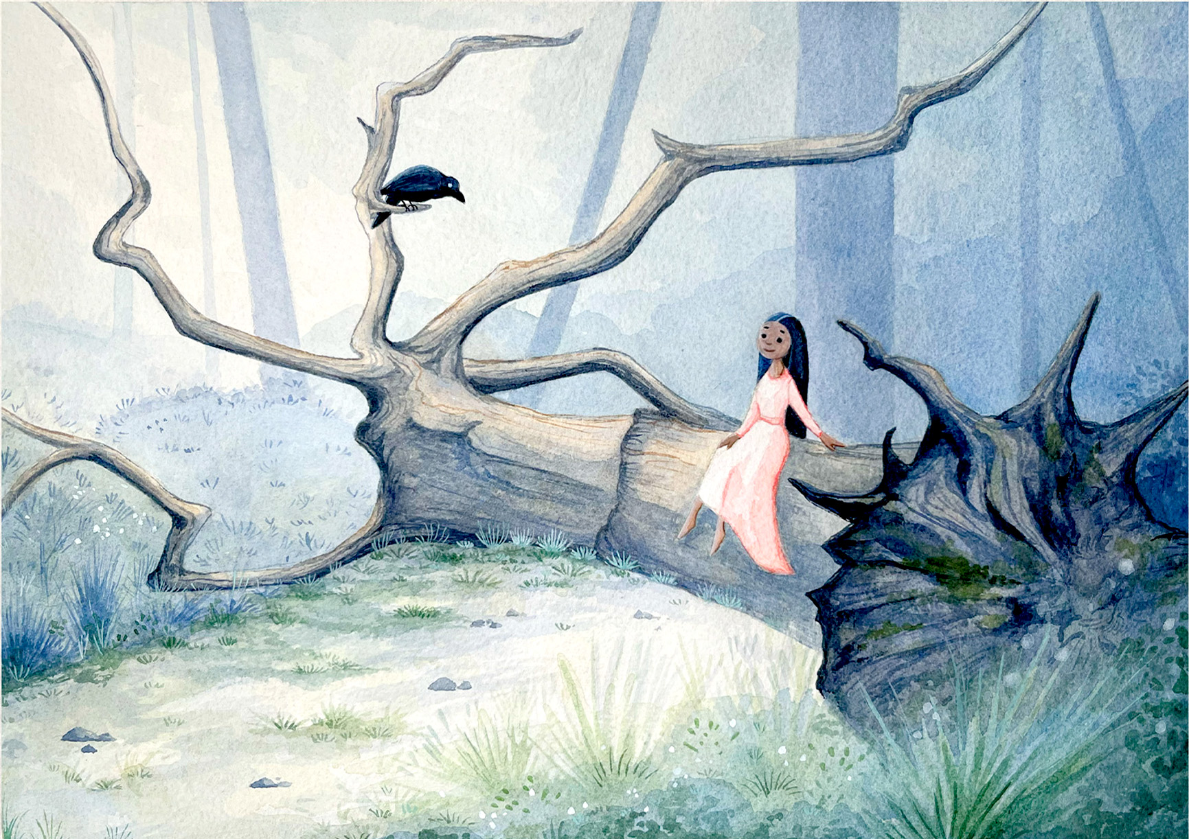 Un matin, une jeune fille du village, connue pour son esprit d'aventure, passa à l'orée de la forêt. À l'approche du bois, elle fût enveloppée d'une brume épaisse, des frissons l'envahirent. Elle décida, tout de même, d'enjamber le seuil de feuilles mortes. Persuadée qu'elle était observée, elle hâta son pas et eût du mal à se frayer un chemin à travers les ronces aux épines aiguisées. Elle décida de poursuivre malgré la peur qui innondait son être. Au loin, la jeune fille aperçut un scintillement. Elle avança dans les broussailles et devant ses yeux apparût une clairière baignée d'une lumière suave et réconfortante. Un arbre à l'allure d'araignée était disposé au centre, telle une statue allongée de tout son long. Elle décida de s'asseoir un moment pour se détendre et profiter de cet endroit si reposant. Un jeune corbeau se posa alors sur une branche du vieil arbre. Était-ce lui l'être énigmatique ?"